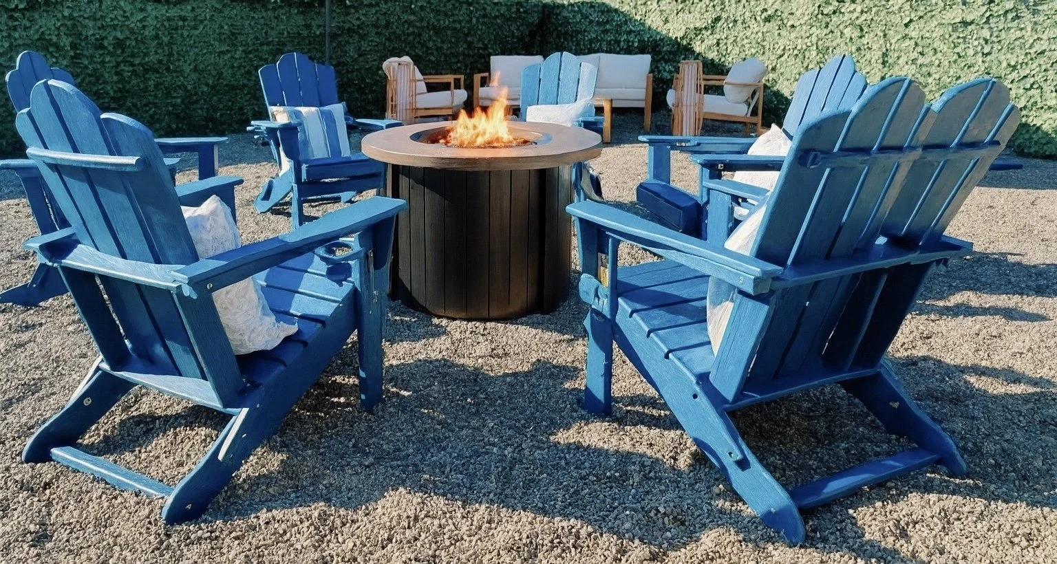 The home features an open-concept layout with designer touches, a game room with arcade classics and a Netflix lounge, and a private backyard with a fire pit, BBQ, and outdoor dining.